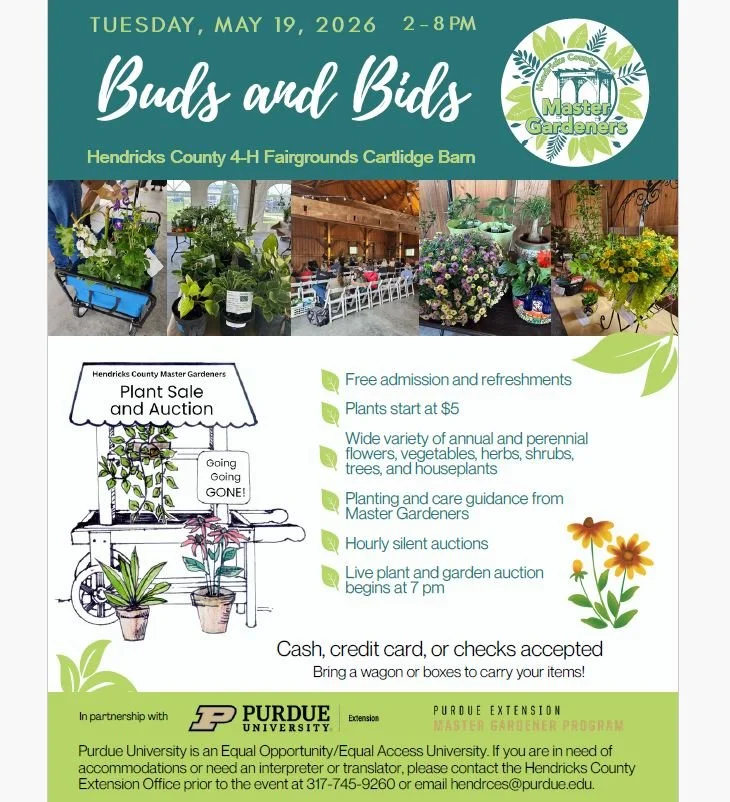 Buds & Bids (HCMG Plant Sale (2026)) Tuesday, May 19, 2026 2:00 PM 8:00 PM Hendricks County Fairgrounds - Cartlidge Barn 1900 East Main Street Danville, IN, 46122 United States (map) Google Calendar ICS